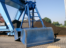 The rope grab is operated on a crane with two hoisting drums. These are the closing rope drum and the suspension rope drum. The grab is hanging on the suspension rope. Opening and closing of the grab shells is done by the closing ropes and the integrated pulley block. (Closing ropes are redirected multiple times through rope pulleys)